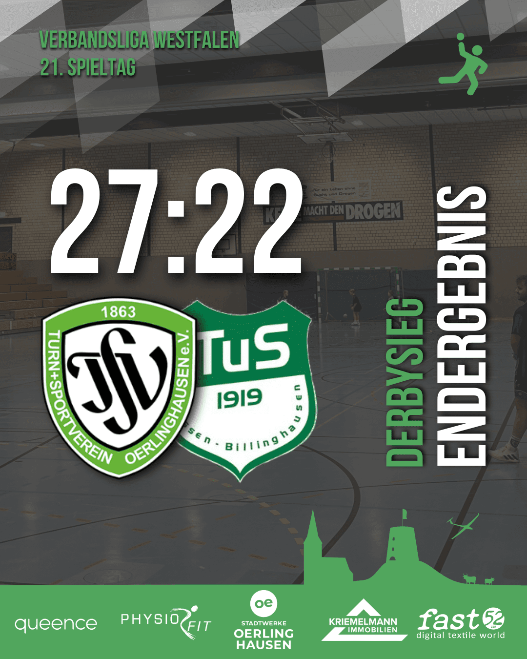 HEIMSIEG IM DERBY! 💚🤍 Die Toensbergsieben gewinnt das Derby gegen den TuS 1919 Müssen-Billinghausen am 21.03.2026 im Schulzentrum Oerlinghausen (NLG) mit 27:22 (15:12) und holt zwei wichtige Punkte im Abstiegskampf.Erste Halbzeit: Wir starteten stark und setzten uns mit frühen Toren von Luca Brunn, Julian Kriemelmann und Florian Teuber schnell auf 4:1 ab. Die Gäste blieben
