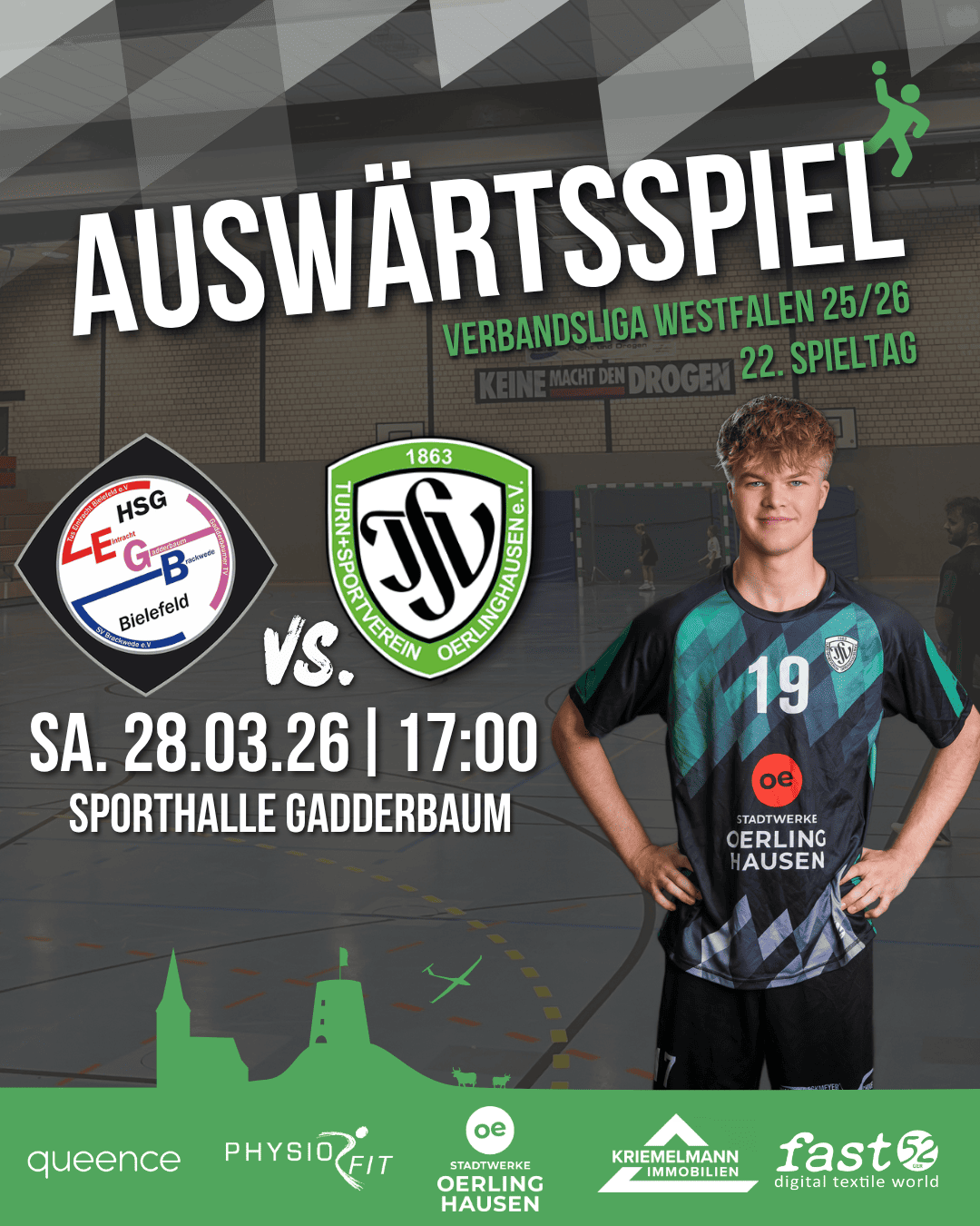22. Spieltag: Auswärtsspiel bei HSG EGB Bielefeld Am Samstag, den 28. März 2026 um 17:00 Uhr ist die 1. Herrenmannschaft des TSV Oerlinghausen in der Sporthalle Gadderbaum in Bielefeld zu Gast — es wartet der 22. Spieltag gegen die HSG EGB Bielefeld.Die Begegnung hat auf dem Papier eine klare Note: Die Toensbergsieben kämpft um wichtige