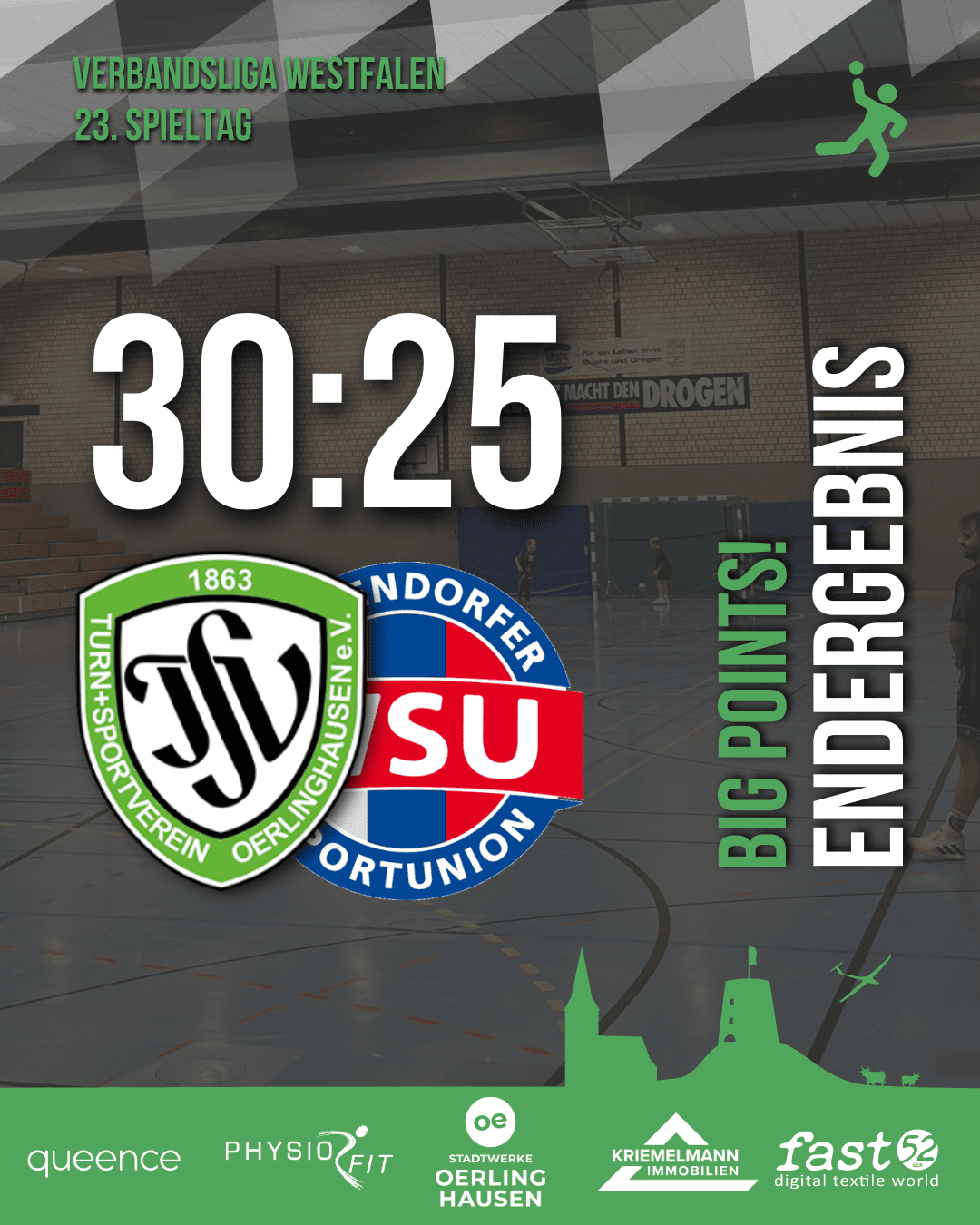 HEIMSIEG MIT BIG POINTS! 💚🤍 Die Tönsbergsieben setzt sich am 18. April 2026 im Heimspiel an der NLG (Schulzentrum Oerlinghausen) gegen die Warendorfer SU mit 30:25 (HZ: 15:9) durch und holt zwei absolut wichtige Punkte im Abstiegskampf. Erste Halbzeit: Von der ersten Sekunde an war klar, wer in dieser Partie das Sagen hat. Der TSV
